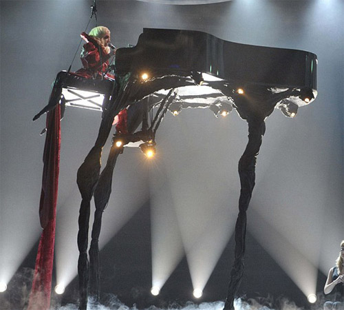 Anyhow, @ It’s Me Again – who says it’s Gaga herself that’s putting money into her performances? I’m more inclined to believe the label has the upper hand in supplying and supporting the funds that go into whatever it is she’s doing, not her. And I’m pretty sure a piano hoisted 15 feet up in the air by equipment used from the venue she performed at, combined with extra large fake piano legs covered in some type of weird looking cloth is not Michael Jackson levels of money.