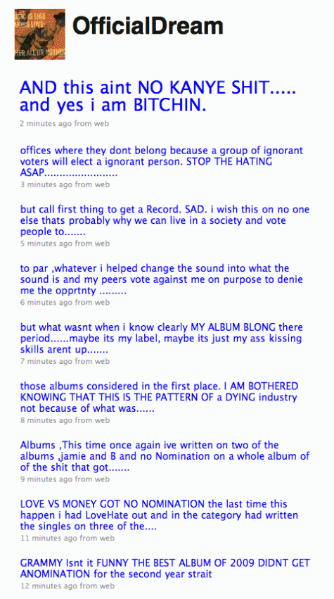 The Dream is a good producer and had a few catchy singles but he is a HORRIBLE singer and artist. I can understand his frustrations though he was everywhere this year and the Grammy committe did not recognize him at all. Better luck next year!