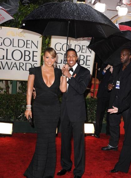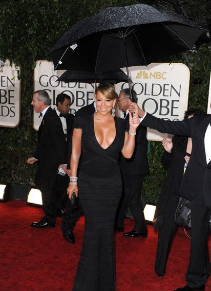 The legendary Mariah Carey and her husband Nick Cannon hit the red carpet the the Gold Globe Awards just moments ago. The icon displayed her amazing figure in this black gown while sheltered from the pouring rain by Cannon. Check out more pics below: