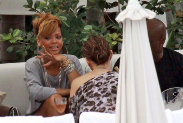 Rihanna and Jennifer Lopez were spotted having lunch in Miami, Florida yesterday. The fashionistas were accompanied by Lopez’s ‘one again/off again’ manager Benny Medina for the gathering at Fontainebleau Hotel. I wonder what they spoke about? Check out more pictures below: