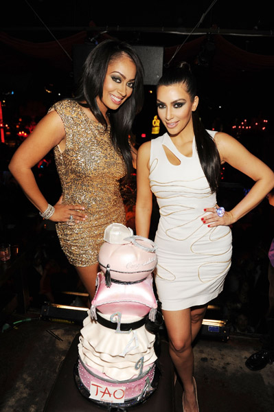 Peep friends Kelly Rowland and Kim Kardashian celebrating at thier pal LaLa Vasquez‘s bachelorette party, which took place last night (May 7th) at Tao nightclub in Las Vegas.