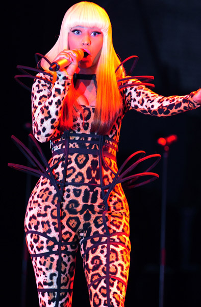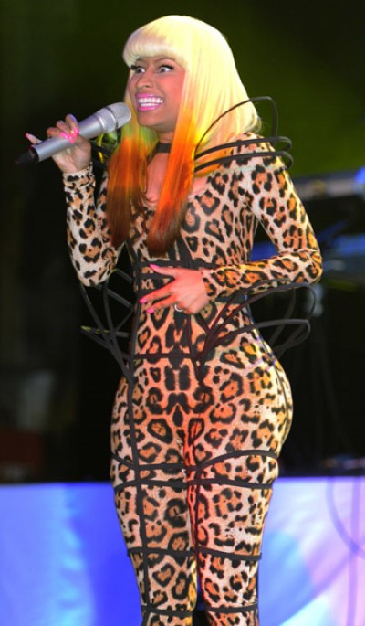 Hip-Pop star Nicki Minaj donned a leopard-print one-piece to perform at Hot 97’s Christmas Concert last night (December 23th). Held at at New York City’s Paradise Theatre, the event also saw performances from the likes of Fabolous and G-Unit’s Lloyd Banks.