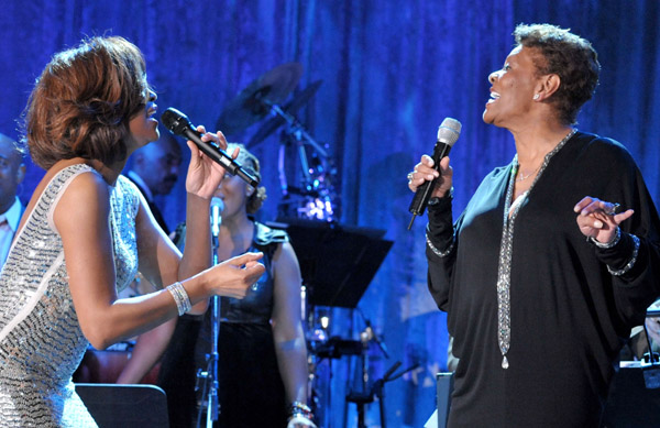 Music’s legends and budding stars aligned last night at Clive Davis‘ annual Pre-Grammy Party (‘Salute to Industry Icons’). Gracing the stage to perform were Whitney Houston (who duetted with aunt Dionne Warwick), Jennifer Hudson, Janelle Monae, R. Kelly, Mary J. Blige, among others.