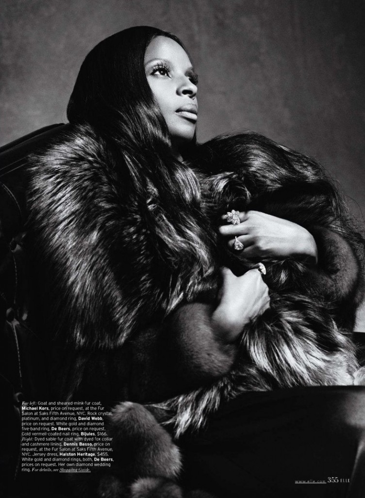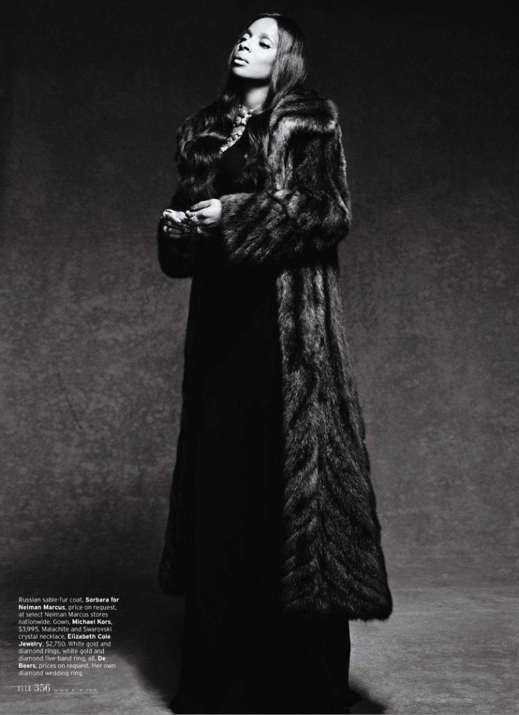 …and white in these glossy photos snapped for the November issue of Elle magazine. The Hip Hop Soul queen, who is readying fans for the premiere of her ’25/8′ visual on October 17th, is seen looking ever-regal (and ever-youthful) in the shots donning a fur coat and ditching her signature blonde-do for a darker number.