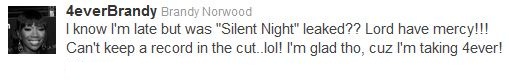 And while no stranger to leak, a particular “Silent Night” – rumored to be included in the next album’s final set – has been making rounds on the net for weeks. Looks like the news just got to Brandy: