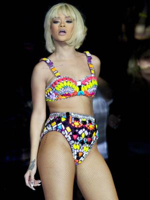 She’s done!!! The only thing is left for her is to show her p***y without the stage costumes to sell her tour now. If I was her mother, I would be embarrassed. No real artist wants to work with her in a track. Mary, Beyonce, Whitney, Mariah, Madonna, I can go on. What happened to real music- her music from Barbados? She’s soo watered down now, this girl can’t find herself anymore, now her last 3 albums were trash, and this picture of her on stage makes her look like a crackhead, don’t be surprised that it will come out she already started doing drugs and get caught in some dumb foolishness just now. All you Navy fans are gonna tell me to get lost, but its the truth. She needs to go away, make some meaningful music and then come back, because right now its lost all meaning. She needs live vocal singing training, I know, I saw her during the “Pon De Replay” days and she wasn’t all that, she was ok, nothing to go crazy for. As for now singing wise- SHE’S DONE!!! Rhianna go, take a break, write some meaningful music and stay on that lane, because right now, your not looking hot!!!