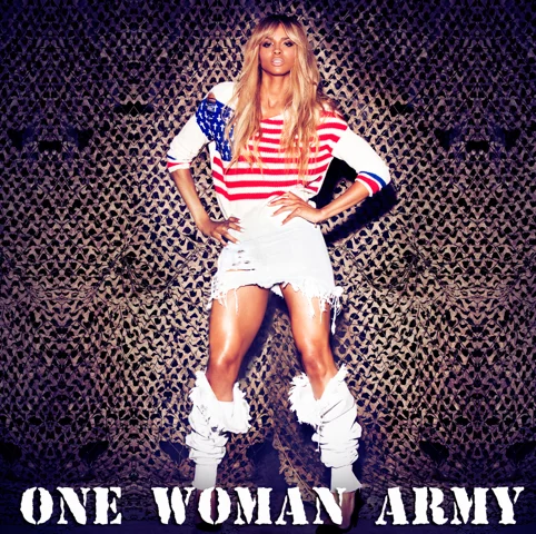 The font is the official font for the US ARMY. MAKES PERFECT SENSE. (ALBUM TITLE IS……ONE WOMAN ARMY).