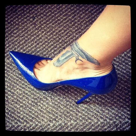 Taking time out of partying, not working on that voice and tweeting profanities, the model posted the above snap of her new artwork- a falcon placed on her left foot.