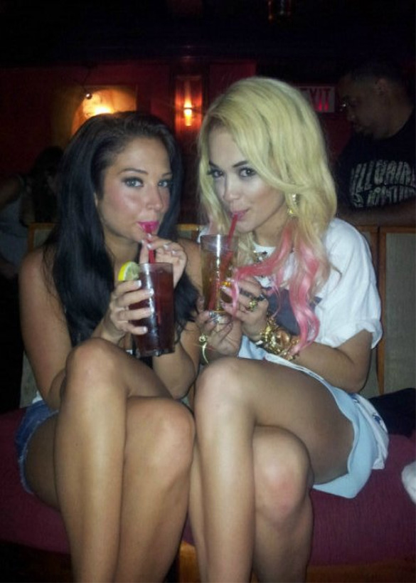 Feast your eyes on X Factor UK judge Tulisa enjoying a quiet drink with Pop Princess Rita Ora.