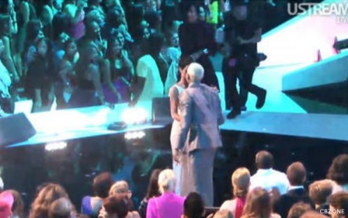 The pair’s stunning public embrace took place at tonight’s MTV Video Music Awards following Brown’s win for Best Male Video. It marks the first time the former couple have been seen together since the infamous “incident” in 2009.