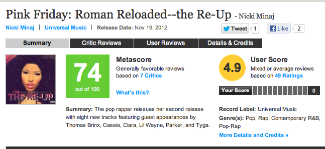 Since when does a metacritic score matter on this site? Because the only time I see something like this is when you’re gassing this chick like always. Sam just face it. SHE FLOPPED. The walmart/target excuse aint working. If u cant find it there then why not just order it from amazon or itunes? You’re making yourself and nicki look stupid by trying to save face when its already cracked.