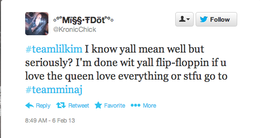 PSA (FAF): STFU, ain’t nobody mad at Nicki’s wack ass and Ladies Night was f***** AWESOME whether you think so or not! Look at how many Female MC’s finally got together for the video and how many cameos were made by other notable Females in the industry! Duh b****, you seem like the one fuming out the ears-mad over following a clown like Nicki. She’s a pop star, not a hip hop star. She’s as big as Taylor’s Swift’s no-talent ass. Oh, btw- learn what the differences are in Icons and Legends. Seems like you have them turned around. You f***** Nicki Stans are more annoying than the cheesecake lumps in her ass. I would smack you with a sock full of rocks if you were in front of me.