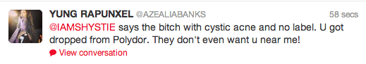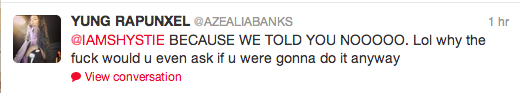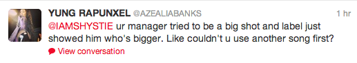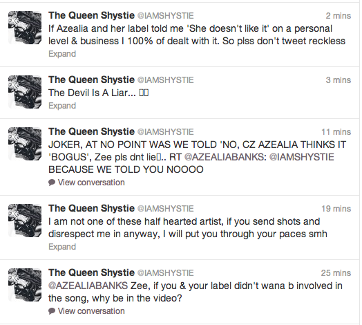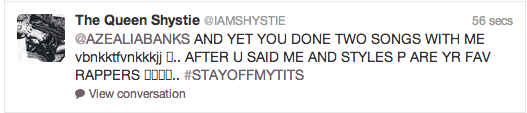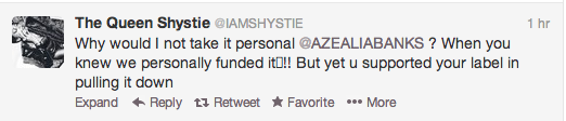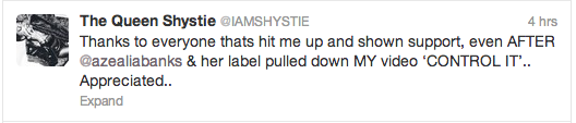 One hour ago, Shystie sent the following to Azealia’s personal Twitter account, after thanking fans for supporting her during the drama: