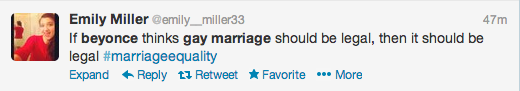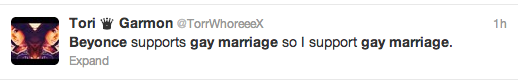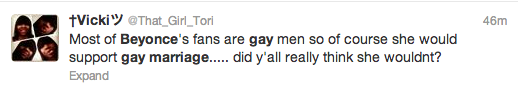Beyonce doesn’t have an opinion of her own though. If everyone was against gay marriage she would be too.