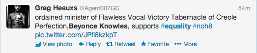 So cute! Everyone wants to be nice to the gays now. One question though? Does Beyonce know the first thing about the Gwen Arujo case? Or what states actually allow same s** marriages? No? Didn’t think so.
