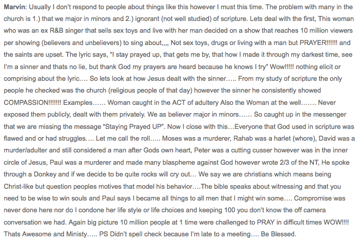 AHH I THINK YOU NEED TO CHECK MARVIN SAPP’S RECORD SALES AND POPULARITY/CROSSOVER TRACK RECORD/APPEAL B/C IF YOU DID YOU’D KNOW HE WAS ALREADY EXTREMELY MAINSTREAM. MAYBE HE IS IS JUST NOT BEING A FAKE CHRISTIAN BY JUDGING HER WHEN THE BIBLE SAYS YE W/O SIN BE THE FIRST TO JUDGE’. I’M SO GLAD YOU ARE PERFECT, NOT A SINNER AND W/O FLAWS. SORRY THE REST OF US WEREN’T SO LUCKY OR LOBED BY GOD; MAYBE THAT’S WHY HE DIED FOR OUR SINS. SMH AT ALL THE FAKE PERFECT CHRISTIANS!!!!……….JENNY JONES!!!