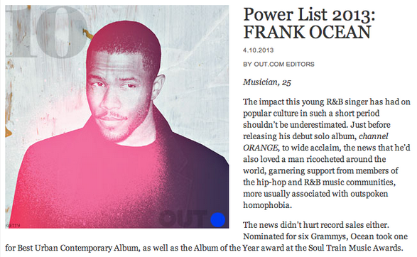 Beating record executive Clive Davis (42) and Bravo boss Andy Cohen (14), OUT’s celebration of the groundbreaking vocalist comes after he watched his debut album ‘Channel Orange’ certified Gold in the US, and after he watched his classic cut ‘Thinkin’ ‘Bout You‘ reach Platinum status for sales of over 1 million units.