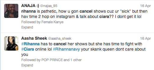 Ugh Rihanna just go the f*** away already. A walking disaster. Anyone with common sense can tell her illness is not that detrimental for her to be cancelling show after show if shes partying it up the day before and getting in twitter arguments at the same time. And if she is a bit ill, its most likely self inflicted so no sympathy there. You and your attention seeking antics are getting on everyones nerves tbh.