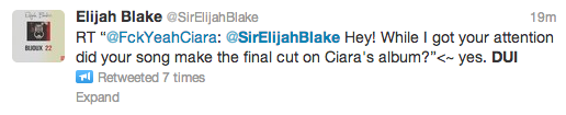 Her appearance on the series came hours after a member of her 'C Squad' got more than they bargained for on Twitter today. For, perhaps in taking a chance to score more info on the LP, they tweeted her long time collaborator Elijah Blake to quiz him on his contribution to the release, to which he shared: