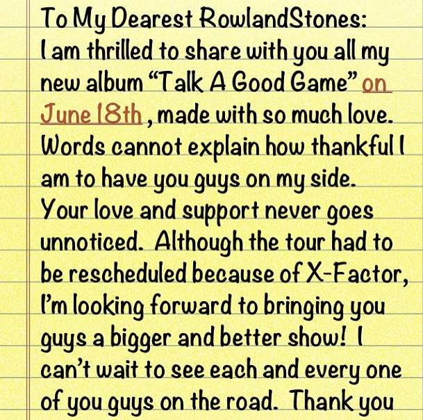 As some fans feared the singer’s recently announced obligations to X Factor USA were conflicting with tour dates, Rowland lent words of assurance via a letter tagged to her official Instagram to ticketbuyers who received word the show was cancelled.