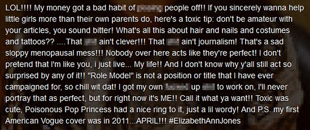 She’s pathetic. So mad over a f****** JOURNALIST. Elizabeth Ann Jones is probably laughing right now.