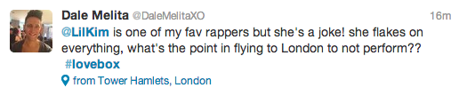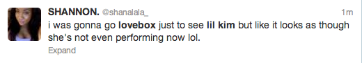 UPDATE: just had word that the main stage at Lovebox is running a little behind atm. @LilKim will be delayed, stay tuned for more updates”