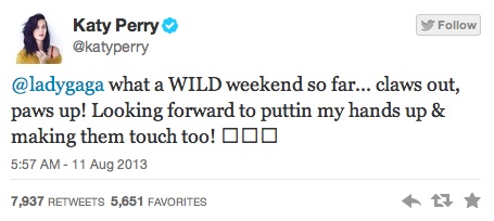 Taking to Twitter, the Billboard belles discussed each other’s new singles (‘Applause’ and ‘Roar’ respectively).
