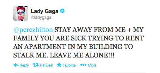 Read more: https://thatgrapejuice.mystagingwebsite.com/2013/08/lady-gaga-perez-hilton-continue-twitter-tussle-singer-slams-blogger-stalking/#ixzz2cMeE4E4D