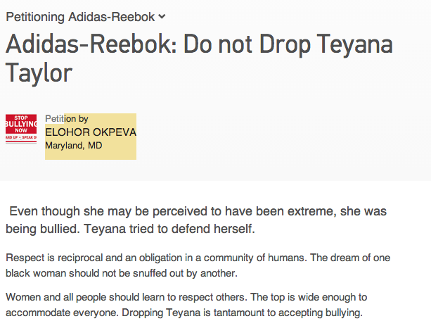 The above is undoubtedly the sentiment employed by fans of socialite Teyana Taylor today, launching a petition to counter the plan to have her pulled from Adidas following an image she shared on Twitter, as is explained here.