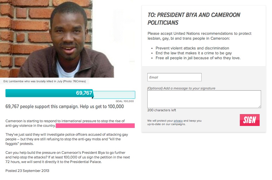 Below his tweet came the link to a petition posted on www.allout.org, birthed to put international pressure on the Republic of Cameroon to stop the rise of anti-gay attacks in the country, urging its President to take action against those responsible for the horrific attacks carried out against the nation’s LGBT community.