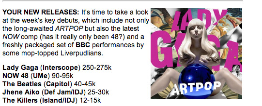 Up until today, the above figure had been tied to the forecasted opening first week sales figure for Lady GaGa‘s latest sonic offering, ‘ARTPOP.’