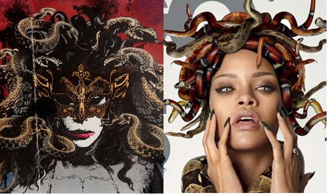 This is so stupid. For one both images take from Medusa. There are thousands of pictures of Medusa over hundreds of years. The painting has on a mask, eyes can not be seen, and a colored lip. Rihannas pic has no mask, eyes can be seen with snake eye contacts, and she doesn’t have a colored lip. The painting does not have a snake around it’s neck. Some people are so thirsty now days.