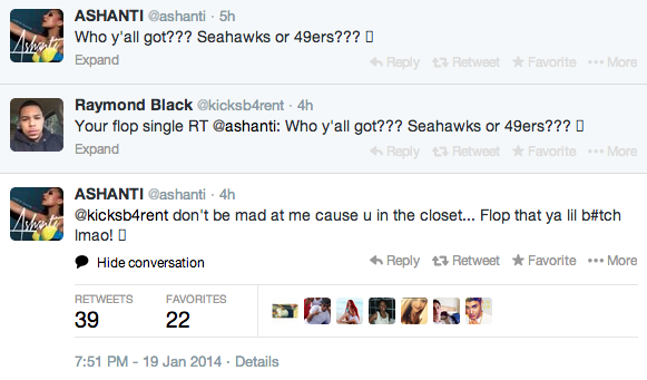 At the same time, Ashanti fighting back using the “in the closet” card much less, making anything dealing with homosexuality negative was wrong on her part. She just lowered herself even more responding back in that way and practically proven that kid’s point: She’s a flop. As we can see, she’s getting more press/spoken about for responding back to a troll on twitter then anything dealing with her music. She might as well accept the flop card.