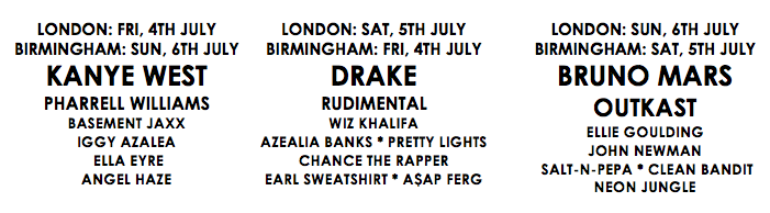 Today saw chart heavyweights Kanye West, Drake, Pharrell, OutKast, and Bruno Mars announced as the headliners for the three-day extravaganza, which takes place between July 4th – July 6th at two locations (which will rotate).