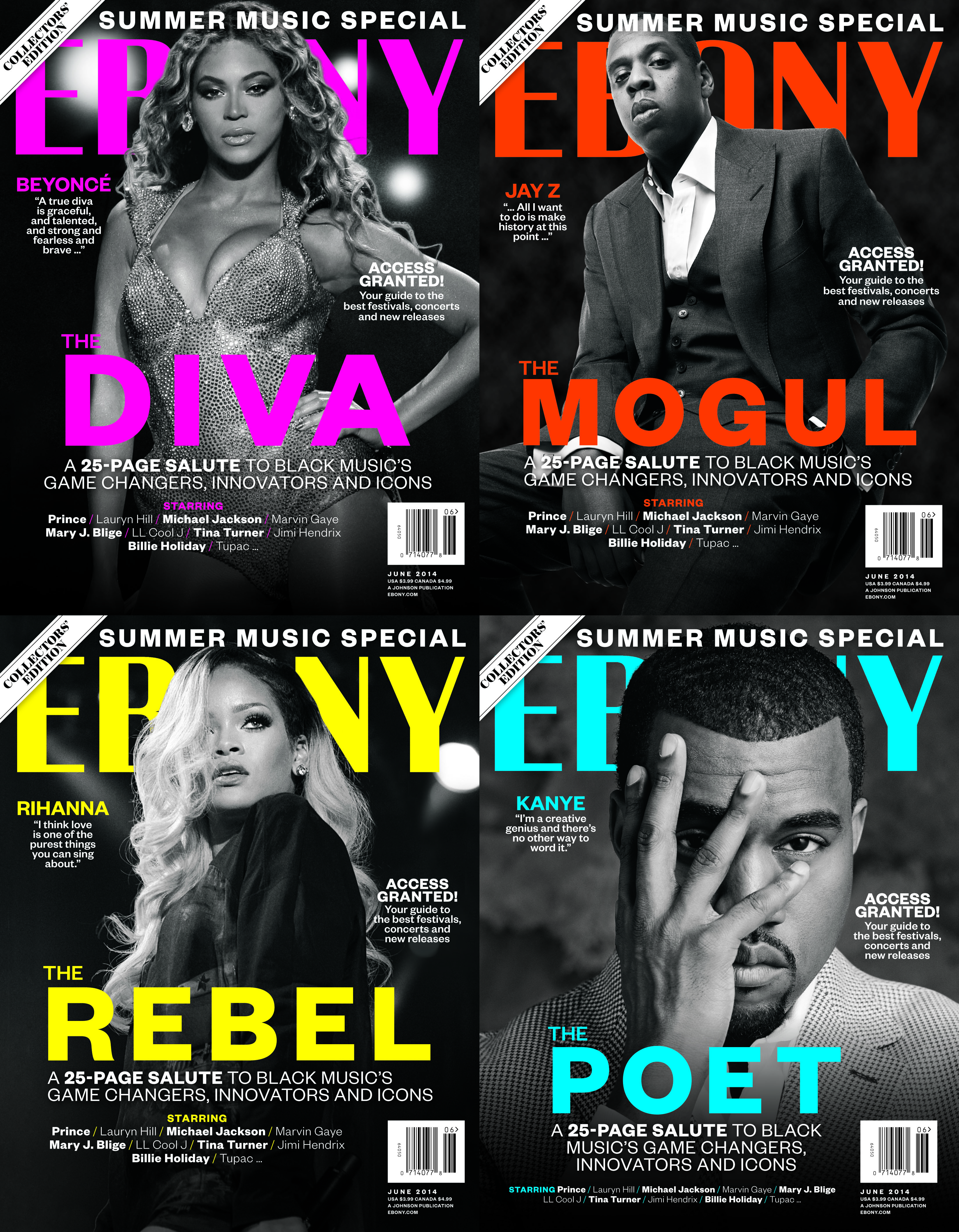 A four-cover series, the latest edition of the popular publication features Beyonce, Jay Z, Kanye West and Rihanna – as a salute to their unprecedented impact on Black music.