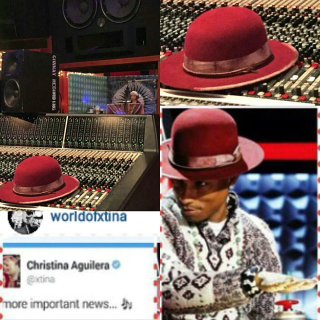 Per a few interesting pic-stiches, strong evidence suggests Xtina has been cooking up hits with Pharrell Williams (see: strategically placed hat)
