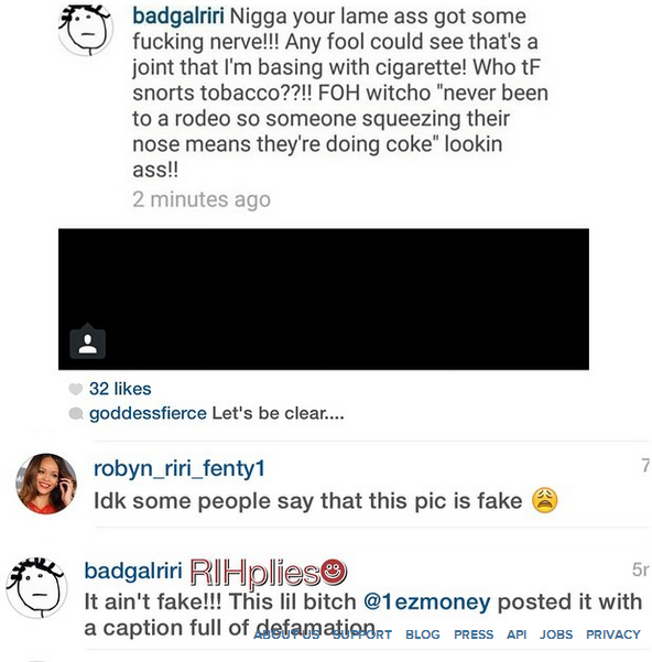Ya know what it always be so funny when people wanna say s*** bout ya like this.I’m not saying do drugs but why leak it.these bloody thirsty people looking for a come up. I have to side Rih on this one but this drama will soon blow over y’all.*Grabs lighter
