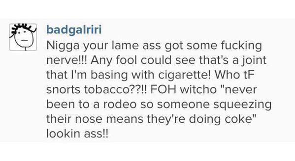 So basically Riri is saying “I WOULD NEVER DO COKE I JUST SMOKE WEED AND CARTONS OF CIGARETTES AND IN THIS INSTANCE I WAS MIXING MY WEED AND CIGS TOGETHER”.. Slay?