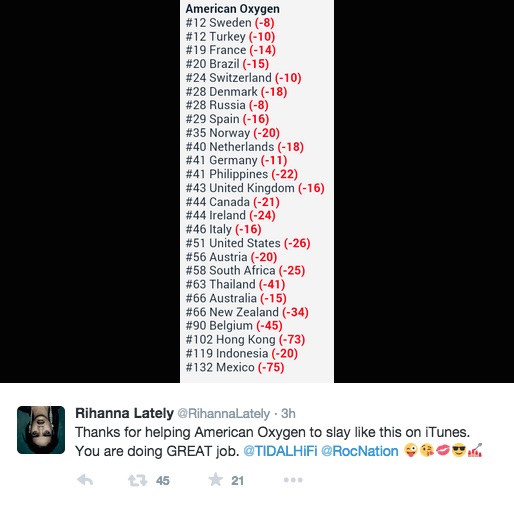Why are folks blaming Rihanna? Blame that stupid ass Tidal b******* that keeps her videos exclusive to their site for weeks before releasing it elsewhere. She never promoted American Oxygen, and people never even heard of it till recently because it was exclusively on TIDAL.