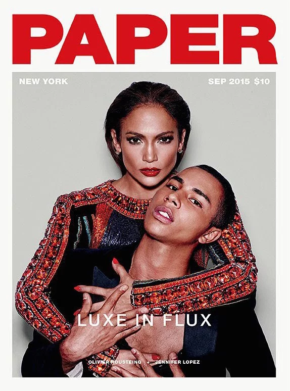 The latter is showcased in earnest a-front of the September 2015 issue of Paper Magazine, which J.Lo covers with Balmain‘s Olivier Rousteing.