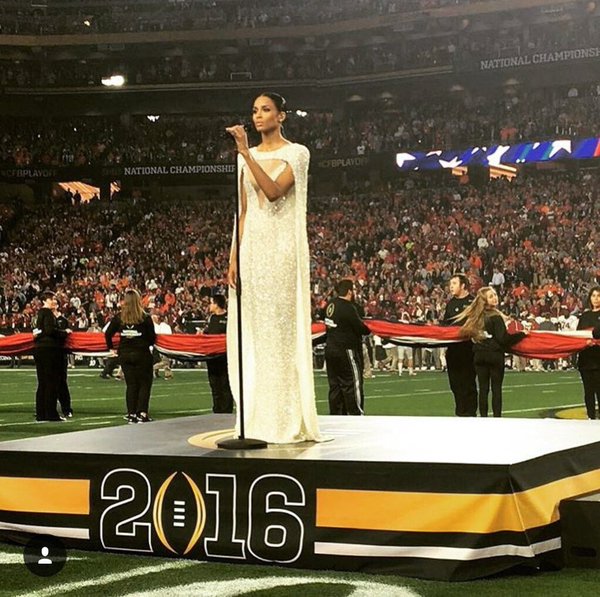 Who wears a gown to sing the national anthem at the NCAA national football championship? Who? It was freaking Alabama vs Clemson for goodness sakes!There was some drunk hick in the stand who would’ve outsang her drunk or not!
