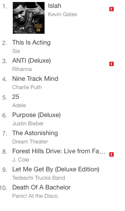 Singer-songwriter Sia‘s sophomore effort ‘This Is Acting’ currently sits above ‘ANTI’ (which was made available to purchase after being free on TIDAL). Both releases are #2 and #3 respectively.