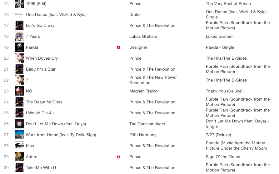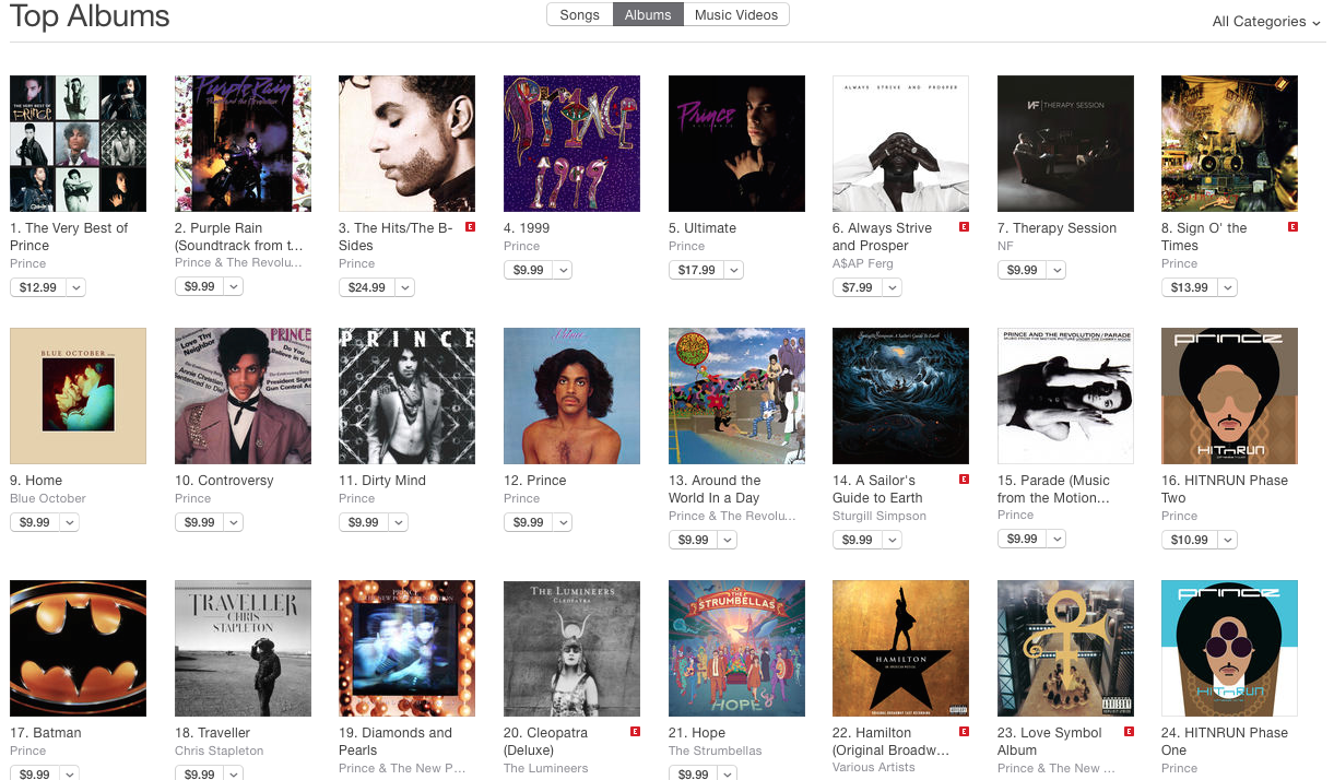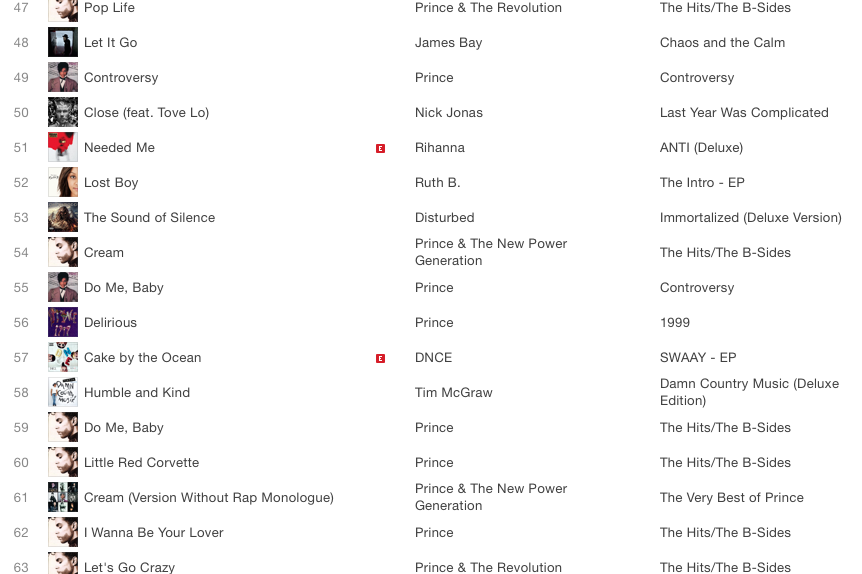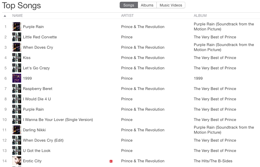 As at writing, an unprecedented 61 Prince songs have charged into the US tally of the Apple retailer.