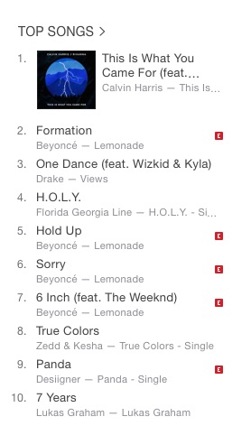Yay FORMATION slaying iTunes!! How? A whole week at #1 after being free for months? Now it’s time to keep HOLD UP and SORRY in top 10.