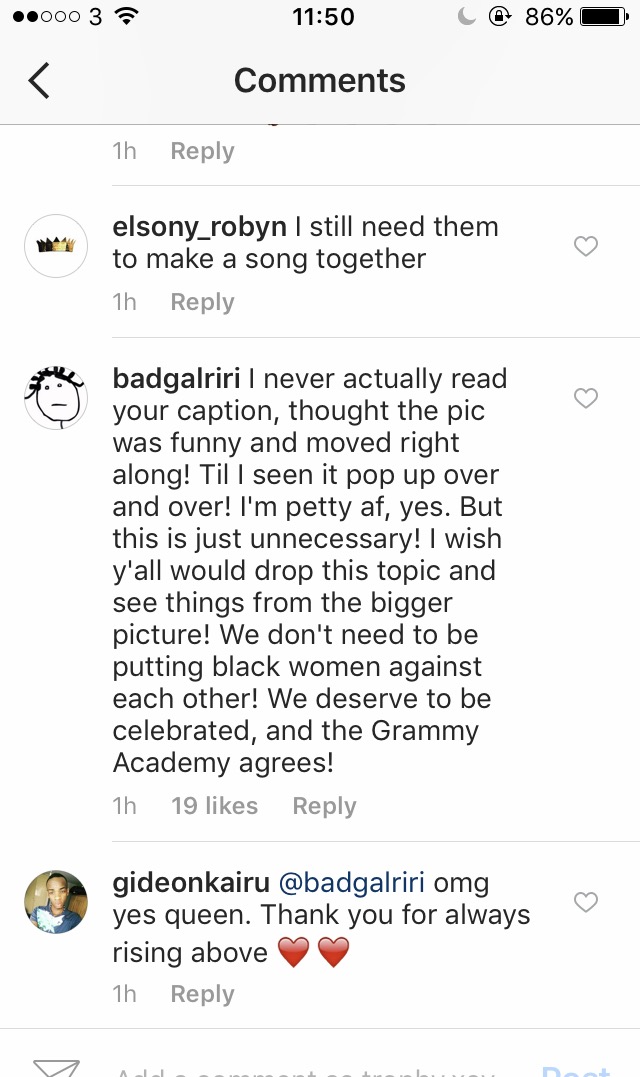 Classy of her to end it all. Beyonce let’s her fans attack everyone, shes never stepped in. She gets her publicity through the controversy. Pure trash. Good move Rih.