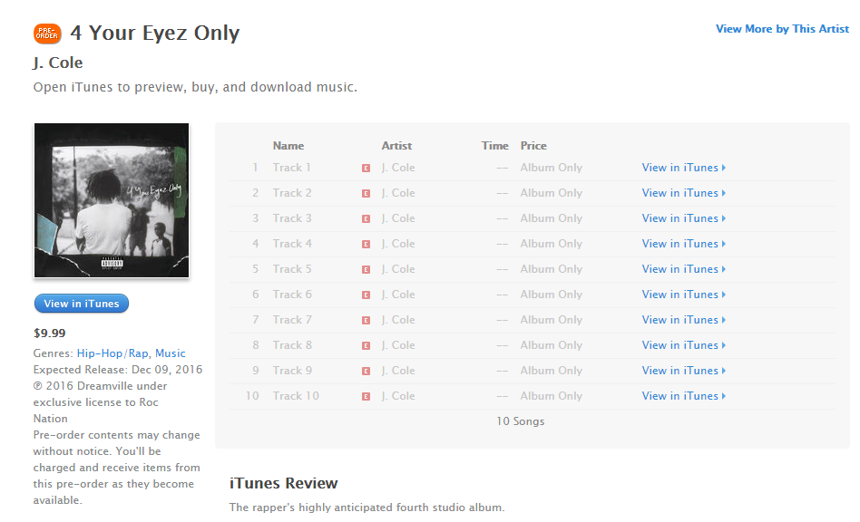A 10-track LP titled ‘4 Your Eyez Only’ has gone up for pre-order on iTunes. The confirmed release date is December 9th – next Friday.
