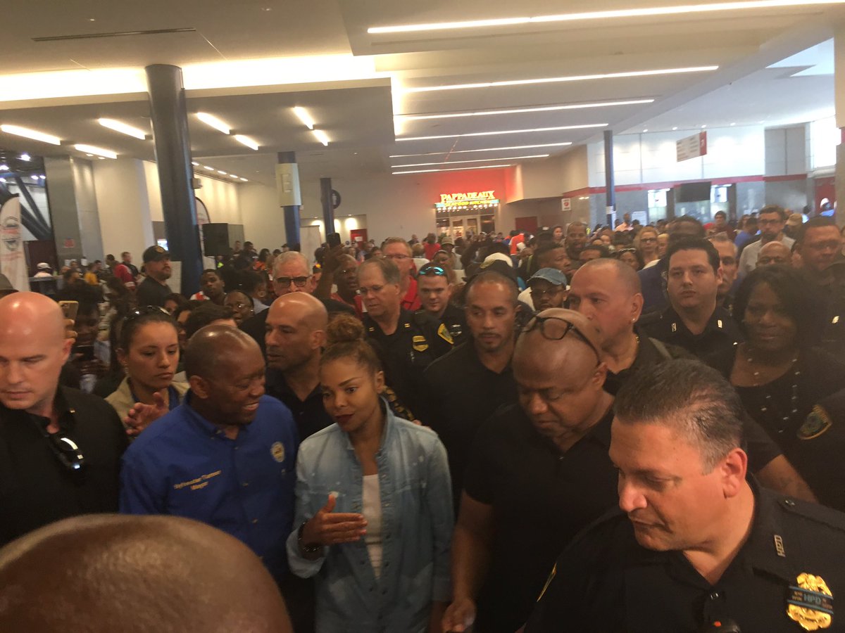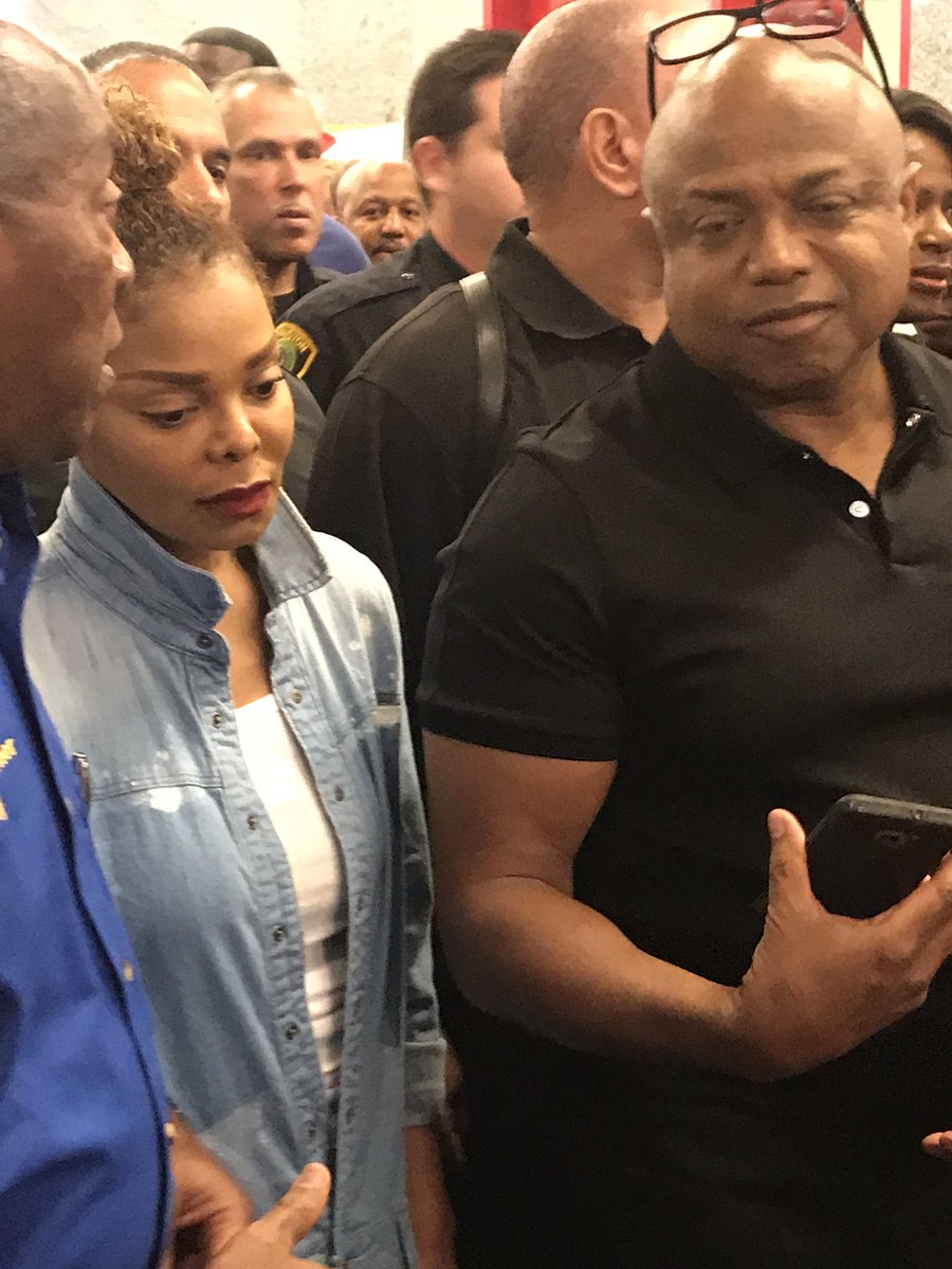 Janet, accompanied by her brother Randy, dancers, and band, visited the Convention Center, which has been turned into a shelter for those affected.