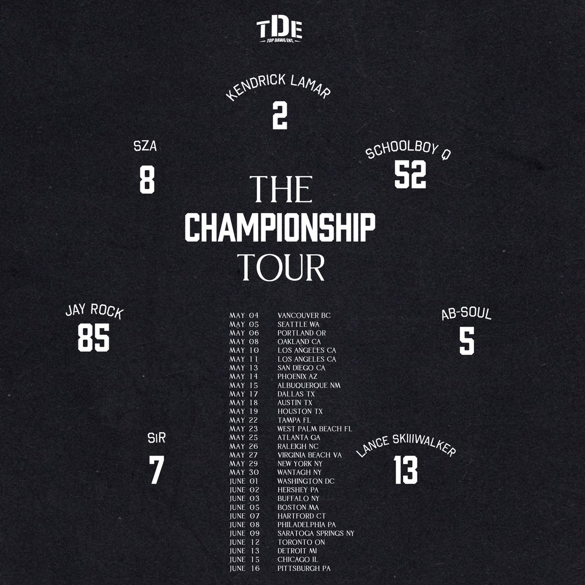 Moments ago on social media, K.Dot officially announced ‘TDE: The Championship Tour’ starring himself, SZA, SiR, Schoolboy Q, Jay Rock, Ab-Soul, and Lance Skiiiwalker.