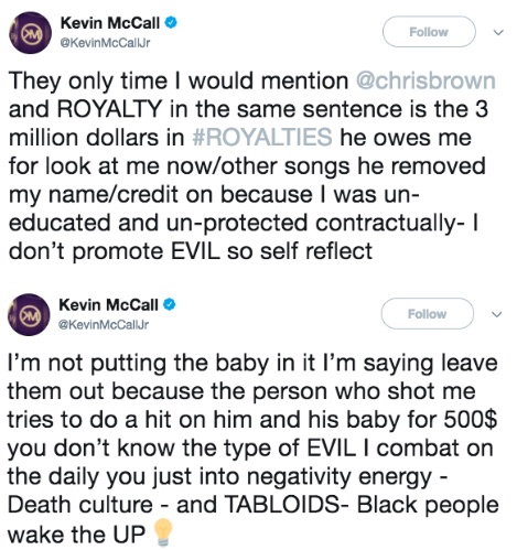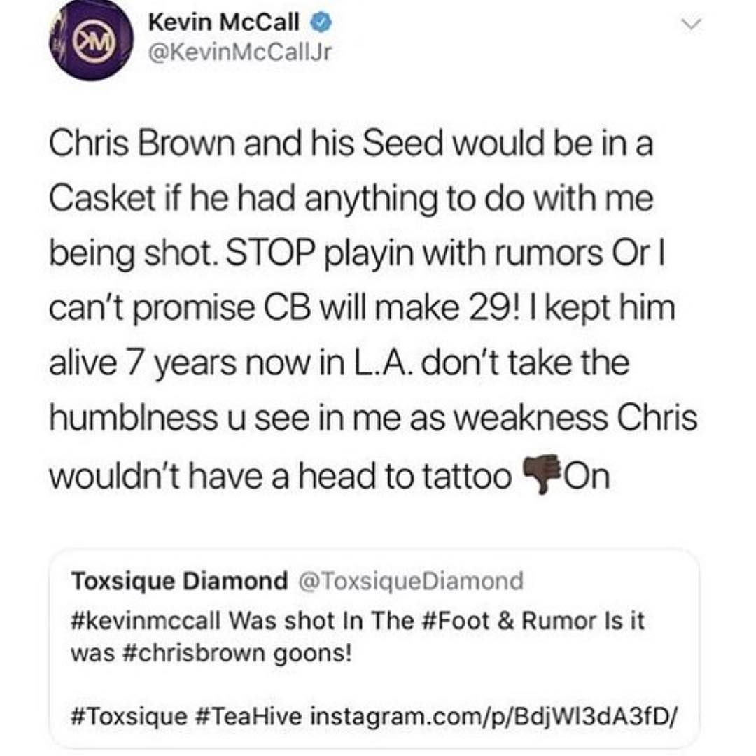 He has 2 daughters & BOTH of his daughters mothers have a restraining order against him, as well as his own grandmother. Kevin McCall really is an mentally unstable person who is jealous that his career never took off. He wants to blame Chris for all of his problems & failures in life. He needs to grow up & accept the fact that he has no one to blame for his failure but himself.