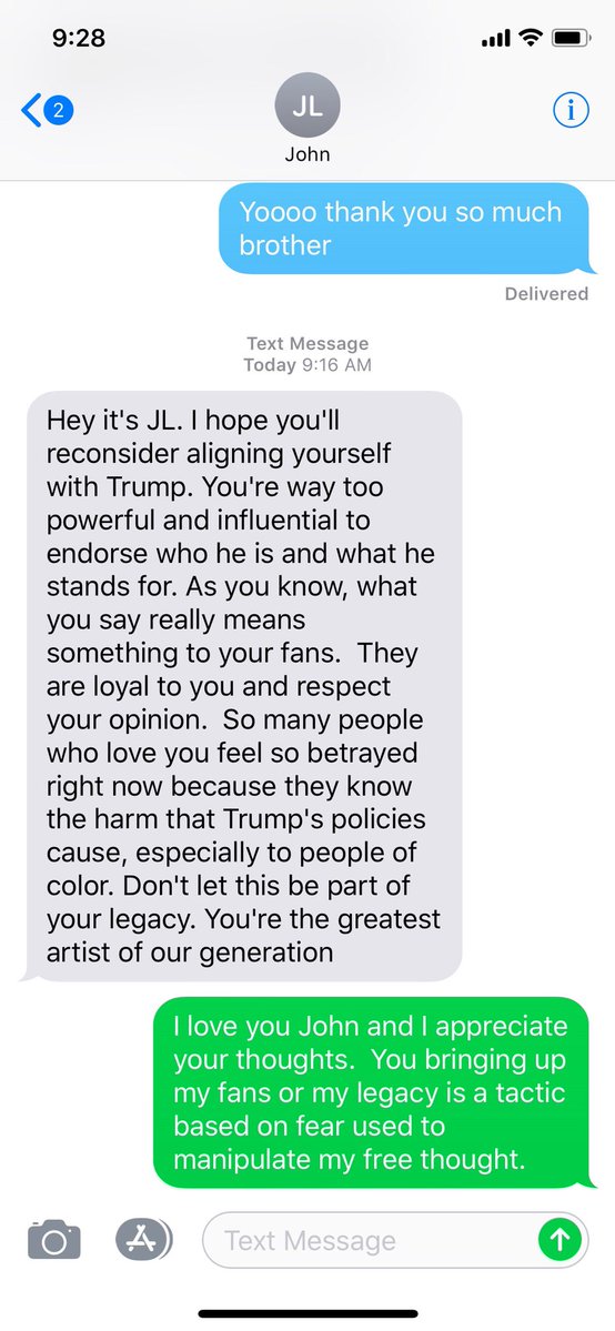 How dare you type that bulls h i t. Kanye has lost the respect of a lot of people because he’s associating with 45. He’s defacing his own status as a bonafide genius. We agree with John that he’s the best artist of this generation. Unfortunately, he just has b I t c h tendencies.